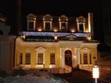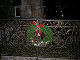 гирлянды ложится на пол, потолок и стены. Венок из ели, увитый яркими лентами,