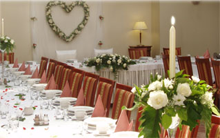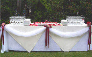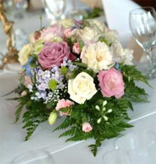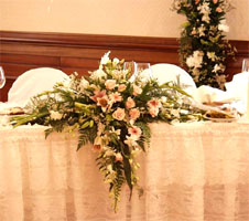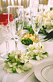 Стол ещё можно украсить гирляндами из живых цветов. Количество настольных композиций